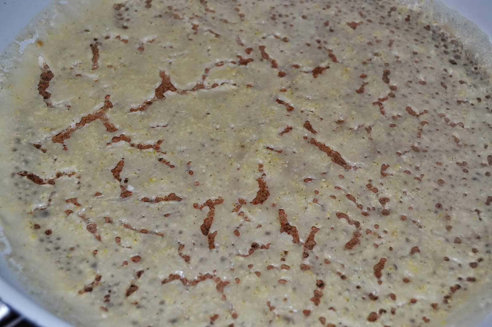 Patelnię rozgrzewamy, dodajemy niewielka ilość oleju i na bardzo gorący wlewamy ciasto naleśnikowe, smażymy je do momentu aż brzegi nalesnika zaczną odchodzić od ścianek patelni, wtedy naszego nalesnika przewracamy na drugi bok. Podczas smażenia ciasto naleśnikowe z kaszy jaglanej i kleiku z siemienia lnianego będzie się rozwarstwiać, jednak to nie zniszczy struktury ani idealnego okrągłego kształtu naleśnika. Usmażony naleśnik będzie przypominał wyglądem haftowana, okrągłą serwetkę :).